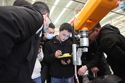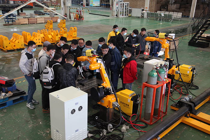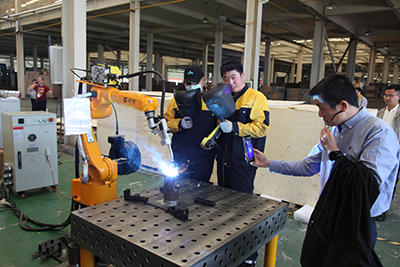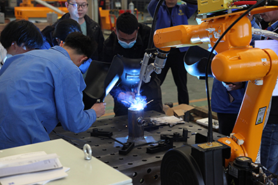 2021年4月26日,北京時代科技股份有限公司組織開設的2021年第一期手工+機器人焊接技能提升班在濟南時代焊接工業園開課了。全部課程為期5天,授課方式為技師現場授課、學員實操焊接練習。本次課程是時代公司精心籌劃的一個提升焊接專業學員機器人操作水平的培訓課。授課老師均為時代公司高級焊接技師。培訓設備為時代6公斤弧焊機器人、時代PNE61-400氬弧手工兩用焊機,時代全數字TDN 5001MB氣保焊機、A160-350半自動氣保焊機等。參加培訓的學員全部為國內職業院校系統內的年輕學員和教師。本次培訓內容主要以實際操作為主,焊接理論為輔。實操內容包括焊條電弧焊、熔化極氣體保護焊、鎢極氬弧焊和機器人熔化極混合氣體保護焊等。