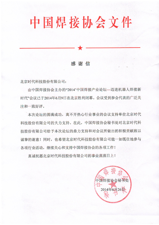 中國焊接協會感謝信