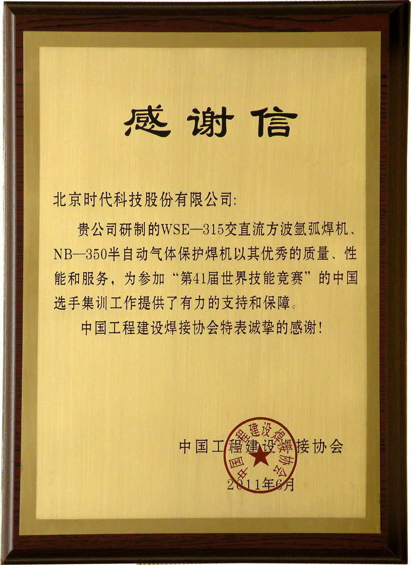 | 2011-06 | 參與世界技能大賽感謝信 | 中國工程建設焊接協會 |