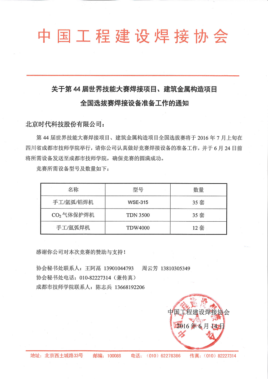| 2016-06 | 第44屆世界技能大賽焊接項目、建筑金屬構造項目全國選拔賽唯一指定用機 | 中國工程建設焊接協會 |